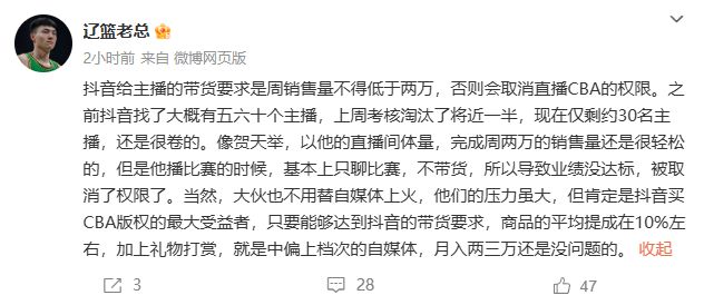 网传截图显示,前辽篮球员贺天举在粉丝群发布了一条消息,称自己在某平台直播CBA比赛,因带货量没有达到官方审核的标准,所以本周被取消了直播资格。 据博主“赵指导说辽篮”解释,某平台对CBA主播有考核标准:给主播的带货要求是周销售量不得低于两万,否则会取消直播CBA的权限。之前找了大概有五六十个主播,上周考核淘汰了将近一半,现在仅剩约30名主播,还是很卷的。像贺天举,以他的直播间体量,完成周两万的销售量还是很轻松的,但是他播比赛的时候,基本上只聊比赛,不带货,所以导致业绩没达标,被取消了权限了。 此前,媒体人杨毅也透露过,某平台与CBA公司签的合同不是传统的版权购买形式,而是电商保底+分成的形式,边播边卖货,卖出钱分给CBA。 本赛季CBA版权格局巨变,签约新平台的同时也意味着体育版权运营从传统付费模式向互联网流量经济的转型。CBA开赛一段时间以来,目前平台也出现了篮球专业解说热度远不及“带货主播”的现象,无论是解说、球迷还是“直播达人”都在重新适应的阶段。 来源:东方体育日报