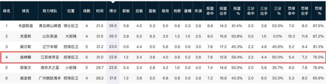 这不是庞峥麟偶然的爆发,他在12月19日面对上海男篮的时候就单场轰下32分4助攻,疯狂的得分秀似乎已经成了他在CBA的常态。赛季至今,庞峥麟场均贡献22.8分3.6篮板4助攻0.8抢断,三项命中率分别是59.4%、50%和75%,在场均30.8分钟的出场时间里承担大量控球任务,却只有2.6次失误,完全可以接受。