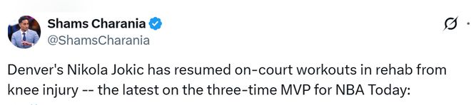 Shams报道称,掘金球星约基奇已经恢复了队内训练,而且恢复进度完全符合预期,甚至还稍稍提前了。按照计划,他有望在本月底重返赛场,这也和球队最初给出的四周康复初步时间表基本吻合。