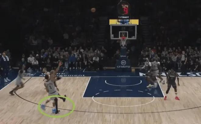 关键时刻,森林狼自己也在犯错,戈贝尔就在文班亚马出手投三分球之后来不及收脚,于是文班亚马踩到了戈贝尔的脚。