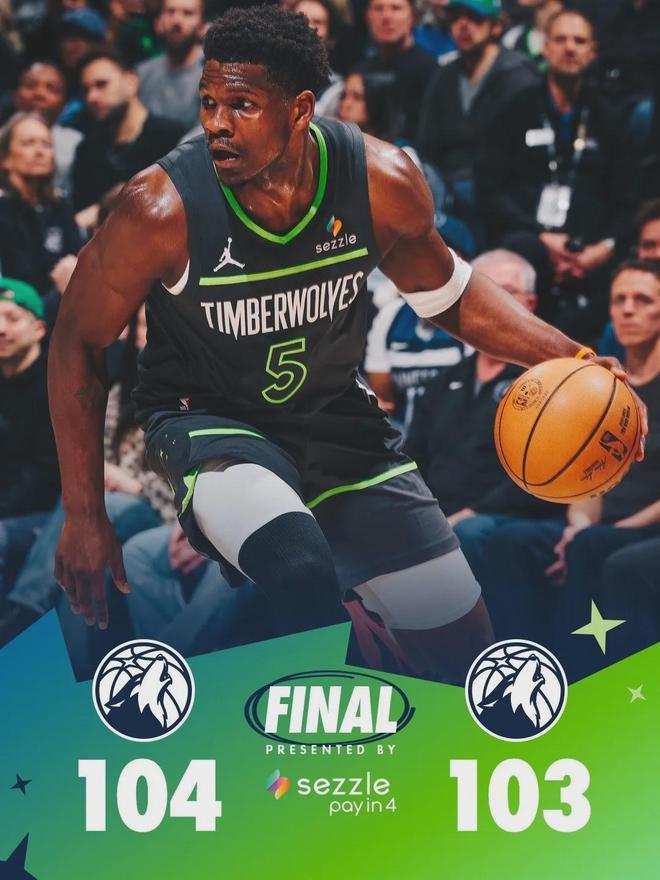最终,爱德华兹的抛投成了准绝杀球,森林狼以104比103险胜马刺,完成了19分大逆转。