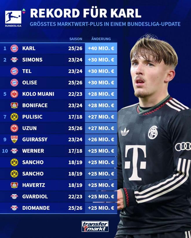 北京时间12月19日,德转更新了德甲球员的身价,拜仁慕尼黑17岁新星伦纳特-卡尔身价暴涨4000万欧元,从2000万欧元跃升至6000万欧元。根据德转官方的统计,伦纳特-卡尔也就此成为了自他们2004年开始引入球员身价数据以来,德甲历史涨幅最高的球员。德甲球员德转历史涨幅榜TOP10:1. 伦纳特-卡尔(拜仁慕尼黑) 25-26赛季 +4000万欧元2. 哈维-西蒙斯(RB莱比锡) 23-24赛季 +3000万欧元2. 马蒂斯-特尔(拜仁慕尼黑) 23-24赛季 +3000万欧元2. 奥利塞(拜仁慕尼黑) 25-26赛季 +3000万欧元5. 科洛-穆阿尼(法兰克福) 22-23赛季 +2800万欧元5. 博尼费斯(勒沃库森) 23-24赛季 +2800万欧元7. 普利希奇(多特蒙德) 17-18赛季 +2700万欧元7. 詹-乌尊(法兰克福) 25-26赛季 +2700万欧元9. 吉拉西(斯图加特) 23-24赛季 +2600万欧元10. 维尔纳(RB莱比锡) 17-18赛季 +2500万欧元10. 桑乔(多特蒙德) 18-19赛季 +2500万欧元10. 桑乔(多特蒙德) 18-19赛季 +2500万欧元10. 哈弗茨(勒沃库森) 18-19赛季 +2500万欧元10. 格瓦迪奥尔(RB莱比锡) 22-23赛季 +2500万欧元10. 扬-迪奥曼德(RB莱比锡) 25-26赛季 +2500万欧元【上咪咕独家看英超