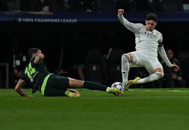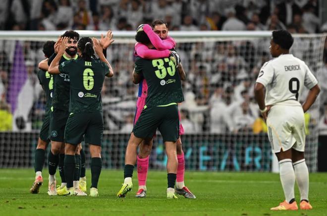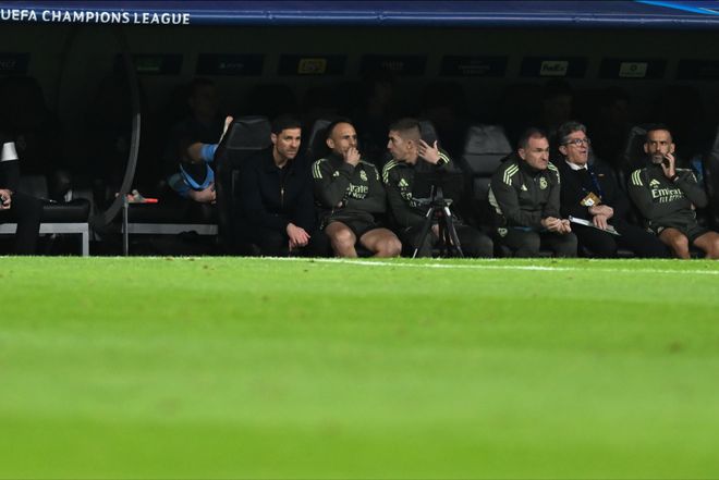 欧冠阶段赛第六轮,皇马坐镇伯纳乌迎战曼城,由于姆巴佩赛前突感肌肉不适,阿隆索排出了一套4-4-2的首发,算是对近来已呈失控之势的更衣室的一种妥协。顶在最前面的,是这次更衣室风波的始作俑者——球场内外都是刺头的维尼修斯。姆巴佩端坐替补席,维尼修斯则坐稳了自己最喜欢和擅长的左路。而教练席上阿隆索却是五味杂陈,这场被媒体和球迷认定决定他帅位的审判之战,此等情况下——赢了,印证自己此前的战术已遭背弃;输了,自己的战术虽正确但帅位却难保。饶是如此,也的确难为了这位被业内广为看好的少帅,哪怕他还顶着皇马名宿的标签。前场没了姆巴佩这尊大神,皇马运转的确流畅了许多。维尼修斯自不必多说,开场便身先士卒,险些为皇马赢得点球;罗德里戈一踢曼城就来劲,他甚至是皇马场上唯一状态和技术都优于对位对手的存在。第28分钟,罗德里戈接贝林厄姆的斜传突入禁区右肋后推射远角,多纳鲁马扑救不及,皮球弹地后滚入空门。罗德里戈打破长达9个月、31场比赛的进球荒,这位早已不在阿隆索计划之中的球星,本赛季首次首发就为皇马取得了领先。这让场边的阿隆索,的确有些面色难堪;然而,让皇马更加难堪的,还在后面。8分钟过后,曼城就扳平了比分——成为罗德里戈破荒背景板的奥赖利在角球混战中高高跃起,将皮球狠狠地砸进库尔图瓦镇守的球门。上半场结束前,被吕迪格折磨了多次的哈兰德终于学乖了一次,被德国中卫抱摔后倒地,主裁蒂尔潘在VAR介入后改判点球,哈兰德亲自操刀命中,为曼城反超比分。这是皇马30多年来首次在欧冠赛场在进球领先却在半场结束时落后。易边之后,双方继续对攻,但皇马的攻势实在是拉胯,除开罗德里戈的进球,全场其余15次射门无一射正。反观曼城,全场12次射门8次射正,4次绝佳机会浪费2次。瓜迪奥拉甚至早早便将哈兰德、福登、切尔基全部换下,比赛尾声阶又换下多库,一副成竹在胸的气度,给足了皇马面子。而阿隆索呢……从始至终也未换上姆巴佩放手一搏,俨然已经放弃挣扎了,而伯纳乌球场最后响起的嘘声,恰如倒计时的钟声。