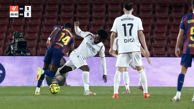 整场比赛,强大的巴塞罗那牢牢占据进攻端的主动权,而奥萨苏纳保持密集的防守站位,双方一直僵持到了下半场70分钟,才由拉菲尼亚打破僵局。此后拉菲尼亚再下一城,最终巴塞罗那以2:0战胜奥萨苏纳,联赛豪取7连胜,同时在先赛一场的情况下,相较皇马的积分优势扩大到7分。也许是近期球队总是先丢球,或者多线作战下的体能影响,因此开场之后,巴萨整体的节奏并不快,而且整体相对求稳、务实。奥萨苏纳虽然以防守为主,但是球队一旦后场断球,由守转攻的节奏非常快,布季米尔连续两脚射门都对霍安加西亚造成了威胁。20分钟之后,巴塞罗那逐渐开始加速,埃里克加西亚、佩德里、亚马尔连续的远射差之毫厘!