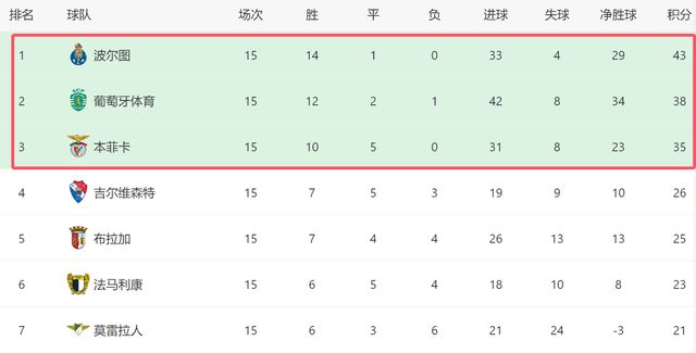 北京时间12月24日,葡超第15轮最后一场比赛,葡萄牙体育做客对阵吉马良斯,结果没有任何悬念。此役葡萄牙体育4-1大胜对手,赛季至今,葡萄牙体育前15轮取得12场胜利,此外还有2场平局,仅仅输给了波尔图,目前排名第二。在此之前,波尔图和本菲卡都已经击败了各自的对手,特别是领头羊波尔图,他们在客场战胜阿维卡,在积分榜上遥遥领先,这也让葡萄牙体育压力巨大,如果他们想保持争冠的希望,本轮就不容有失。比赛开始后,吉马良斯一度依靠主场优势,在场上和葡萄牙体育打成均势,不过实力上的差距,最终还是让吉马良斯无力爆冷。第32分钟,特林康抓住机会打进1球,为葡萄牙体育打破僵局,之后伊奥尼迪斯破门,半场结束葡萄牙体育2-0领先。下半场,主队早早依靠伊曼纽尔的进球,把比分追成1-2,不过很快他们又连丢2球,最终葡萄牙体育在客场4-1大胜对手,顺利拿到3分。截至目前,本轮葡超的比赛已经全部结束,加上葡萄牙体育,葡超传统3强都拿到了3分,积分榜上的形势,也没有发生变化。如今波尔图依然排名第一,他们领先葡萄牙体育5分,而本菲卡则落后榜首8分,目前位居第三。从本赛季的表现来看,波尔图无疑是夺冠大热门,他们前15轮,仅仅只有1场平局,其他比赛全胜,如果后面的比赛,波尔图能延续如此状态,本赛季冠军将毫无悬念。万一下半程波尔图掉链子,那葡萄牙体育就将看到希望。相比之下,本菲卡争冠基本没戏,穆帅的球队虽然至今保持不败,但是前15轮他们出现5场平局,这家葡超豪门,很可能为平局过多付出代价。看到葡萄牙体育在客场大胜,穆帅无疑压力巨大,因为只有对手丢分,本菲卡才有希望反超。根据规则,葡超前2名才有欧冠资格,也就是说,哪怕本菲卡本赛季无缘联赛冠军,他们也必须反超葡萄牙体育,才能拿到下赛季欧冠资格,否则的话,这个赛季将彻底失败。接下来,本菲卡不能再轻易丢分了,一旦无缘下赛季欧冠,穆帅恐怕又要面临下课危机了!