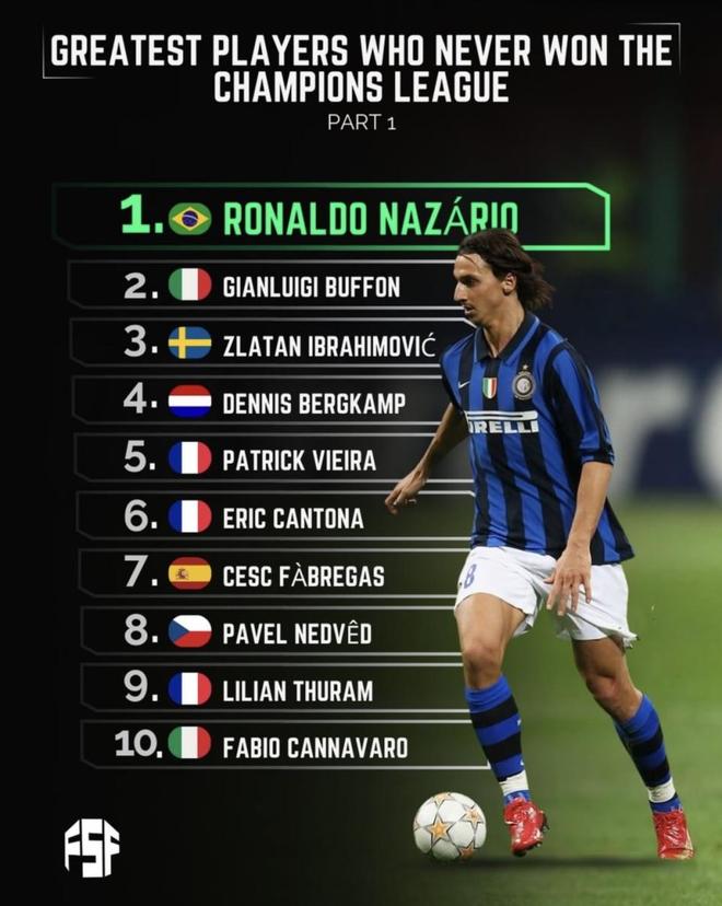 • 从未赢得欧冠冠军的最伟大球员榜单发布!大罗高居第一伊布上榜