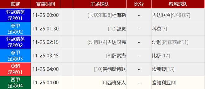 英超 阿森纳 4-1 托特纳姆热刺 北京时间11月24日00:30,英超联赛第12轮,阿森纳主场迎战热刺。上半场特罗萨德打破僵局,梅里诺挑传助攻,埃泽扩大比分,热刺0射门,下半场埃泽帽子戏法,特罗萨德传射,里沙利松神仙球吊射扳回一城。最终阿森纳主场4-1战胜热刺,枪手联赛9轮不败+各赛事15场不败,领先第2名切尔西6分,热刺3轮不胜位居第9。西甲 埃尔切 2-2 皇家马德里 北京时间11月24日04:00,西甲联赛第13轮,皇家马德里客场挑战埃尔切。上半场双方均无建树。皇马半场0-0战平埃尔切。下半场,费巴斯首开纪录,赫伊森扳平,打进他在皇马的首个进球,随后阿尔瓦罗-罗德里格斯打进一球,贝林厄姆破门扳平比分。全场比赛结束,埃尔切2-2皇马,联赛两连平。目前仅1分优势领跑积分榜。西甲 赫塔菲 0-1 马德里竞技 北京时间11月24日01:30,西甲联赛第13轮,马德里竞技客场挑战赫塔费。上半场略伦特伤退,下半场拉斯帕多里造乌龙,赫塔费补时中框。最终马竞客场1-0战胜赫塔费,马竞取得联赛5连胜+12轮不败,马竞积28分位居第4名,距榜首巴萨3分。意甲 国际米兰 0-1 AC米兰 北京时间11月24日03:45,意甲联赛第12轮,国际米兰主场迎战AC米兰。上半场迈尼昂献神扑,阿切尔比头球中柱,两队暂0-0战平;下半场普利西奇破门,图拉姆造点,恰尔汗奥卢点射被迈尼昂扑出,最终AC米兰1-0力克国际米兰,在积分榜上反超对手,升至第二位。其他赛事比分:英超 利兹联 1-2 阿斯顿维拉西甲 皇家奥维耶多 0-0 巴列卡诺西甲 皇家贝蒂斯 1-1 赫罗纳德甲 RB莱比锡 2-0 云达不莱梅德甲 圣保利 0-1 柏林联合意甲 维罗纳 1-2 帕尔马意甲 克雷莫纳 1-3 罗马意甲 拉齐奥 2-0 莱切法甲 欧塞尔 0-0 里昂法甲 布雷斯特 3-2 梅斯法甲 南特 1-1 洛里昂法甲 图卢兹 0-1 昂热法甲 里尔 4-2 巴黎足球会 赛事前瞻敬请留意