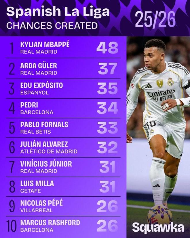 • 本赛季西甲创造机会榜:姆巴佩48次居首,居莱尔37次第二
