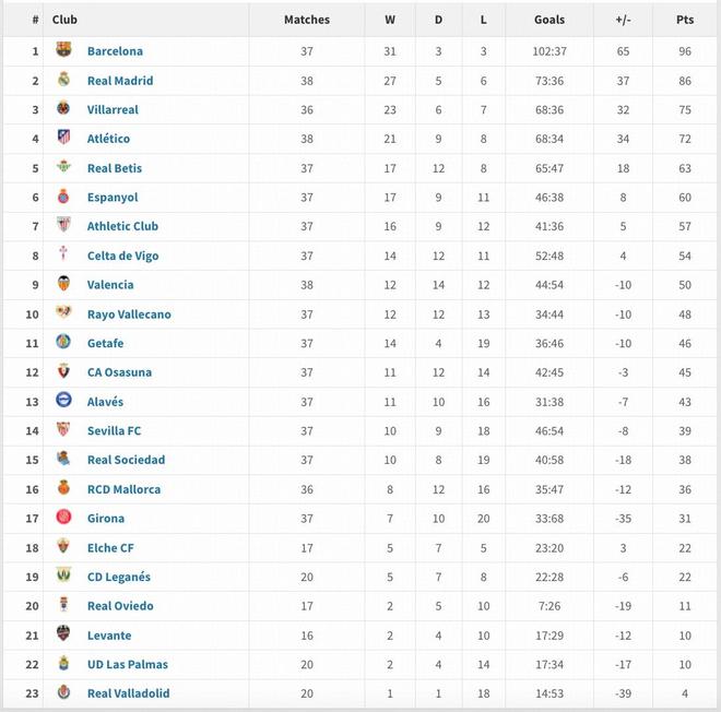 2025年度西甲积分榜:巴萨37战31胜高出皇马10分,马竞第四