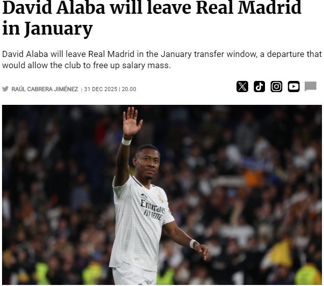 • 皇马冬窗离队第2人浮现!美国球队150万报价阿拉巴