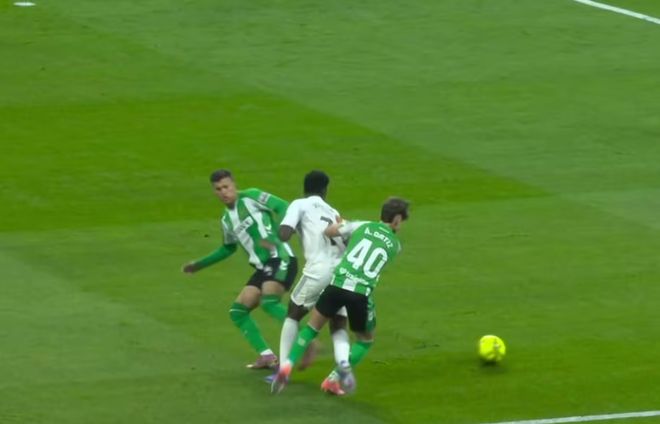 比赛的第5分钟,维尼修斯突入禁区左肋,在两名贝蒂斯球员的夹击下倒地,主裁判并未判罚点球。随后,视频助理裁判介入判罚,最终确认奥尔蒂斯并未犯规。
