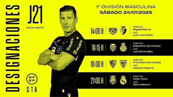 西班牙足协官方公布了周六西甲四场比赛的裁判安排,索托-格拉多将执法皇马客场对阵比利亚雷亚尔。
