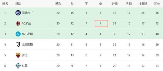 米兰在三分制意甲第三次前20轮只输1场,前两次最终均夺冠