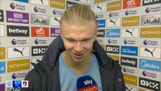英超第10轮上演梅开二度帮助曼城主场3-1击败伯恩茅斯之后,哈兰德接受了来自天空体育的采访。这是一场重大的胜利,这场胜利让曼城升到了第二位,这场胜利有多重要?是的,感谢这场重要的胜利,在输掉一场糟糕的客场比赛之后能够反弹的感觉很好。所以,是的,这感觉很棒。你打进了两个球,这并不令人意外,但请跟我们聊聊特别是第一个球,你和门将一对一,你在面前看到了什么?我努力通过做好我的工作来为球队做出贡献。是的,我们又赢了,赢球很好,那个时候每个人都很开心。所以,这就是我们一直努力去做的。现在在国际比赛日之前还有两场重要的比赛,保持专注。拉扬-谢尔基今天首发了,看起来你们俩在场上配合得相当不错……是的,是的,我们都知道他的能力,所以关键在于努力发挥出每个人的最佳水平。今天他给了我两次精彩的助攻,所以,是的,希望未来能有更多。我们也听说,这是你在曼城生涯当中第15次在打进两球的情况下被换下,所以你今天有多渴望上演帽子戏法?你觉得你能再打进一个吗?是的,当然,所以你需要去问佩普(瓜迪奥拉)。我认为,在我被换下的时候,可能会有一些范特西玩家不太高兴(笑)。你有没有对自己感到吃惊?因为你现在进球的状态非常好,看起来你势不可挡……我上一场比赛没有进球,所以我要再次努力帮助球队赢球,这是我的目标。而且,无论是通过进球还是帮助他们赢得对抗,只要我们赢球,这都无关紧要,这就是我想做的。我想赢得比赛,我想帮助球队,成为一支更好的球队,成为一家更好的足球俱乐部,所以那是我的工作。【上咪咕独家看英超