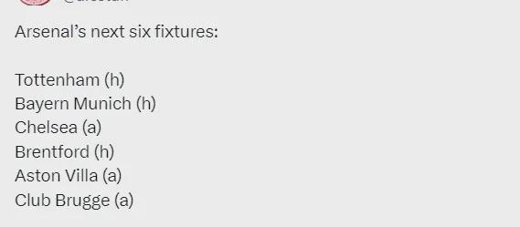 阿森纳未来6场比赛:主战热刺、主战拜仁、客战切尔西、主战布伦特福德、客战维拉、客战布鲁日。可怕的赛程还在后面,这6个对手没有一个省油的灯,也看不到一个可以轮换主力的比赛……所以某种程度上,我觉得国际比赛日来的恰到好处,阿森纳可以缓缓(这套首发快到极限了),受伤的人可以复出,如果接下来连着踢这几个,搞不好真能崩几场……回来再踢会好很多,前提是这两周别有人受伤……