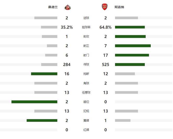 连续多年高投入的英超豪门阿森纳,在本赛季在攻防两端都展现出了超强的统治力,在周中欧冠第四轮客场大胜捷克球队布拉格斯拉维亚后,枪手已经各项赛事豪取十连胜,其中在联赛以8胜1平1负的战绩高居积分榜榜首。本周末英超第十一轮联赛全面打响,阿森纳奔赴客场挑战最强升班马桑德兰,本场比赛阿森纳在先丢一球的情况下,靠着萨卡和特罗萨德的进球,一度看到了延续连胜势头的希望,但布罗贝伊伤停补时的倒钩打门,帮助桑德兰2-2绝平阿森纳,让枪手的十连胜戛然而止。时隔多年重返英超的桑德兰,表现让所有球迷眼前一亮,前十轮战罢取得了5胜3平2负的战绩,在积分榜上仅次于阿森纳、曼城和利物浦排名第四,这也是球迷将他们称之为本赛季最强升班马的原因,第九轮联赛他们更是在斯坦福桥将新科世俱杯冠军切尔西斩于马下,可见竞争力不容小觑。不过阿森纳最近3次遇到桑德兰全部获得了胜利,为了延续强势的发挥,阿尔特塔此役在光明球场也是尽遣主力出战,在4231的阵型中,让拉亚镇守龙门,廷伯、萨利巴、加布里埃尔和卡拉菲奥里构筑后防,苏维门迪和赖斯搭档双后腰,萨卡、埃泽和特罗萨德在中场一字排开,梅里诺则出任单箭头。比赛正式开打后,阿森纳反客为主率先制造杀机,第15分钟赖斯的直接任意球打门,被桑德兰门将奋勇扑出,第25分钟桑德兰本方禁区前沿回传失误,埃泽抢断后的打门没有压住,一脚高射炮帮助对手完成了解围。逃过一劫的桑德兰,在第36分钟率先打破场上平衡,门将开大脚直接把皮球送到阿森纳禁区,穆杰莱头球摆渡,跟进的巴拉德捅射建功,让场面略显被动的桑德兰带着1-0的领先,回到了更衣室。重返赛场之后,阿森纳发起了疯狂的反扑,第54分钟赖斯抢断后,迅速推反击,萨卡右路低射建功,将比分追至1平,第65分钟枪手错失反超良机,苏维门迪的抽射击中横梁被弹出,但9分钟之后,特罗萨德的世界波,还是帮助阿森纳将比分改写为了2-1,掌握住了获胜的主动权。就在球迷认为拥有英超最强防守的阿森纳,能够如愿以偿带走胜利时,桑德兰在伤停补时第94分钟,再次攻破了拉亚的十指关,布罗贝伊在接到队友的头球摆渡后,抢在拉亚解围之前,用一脚精彩的倒钩,帮助桑德兰打入绝平进球,将全场比分定格为了2-2。【本场数据】本场比赛结束之后,阿森纳在多赛一场的情况下,领先第二名曼城7个积分,本轮蓝月军团将会在伊蒂哈德球场迎战利物浦,阿尔特塔如今也是坐山观虎斗,最希望看到的结局就是曼城和利物浦握手言和。