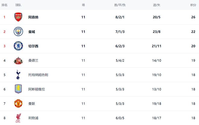 英超第11轮进行了多场比赛。阿斯顿维拉制造惨案,在主场以4-0横扫伯恩茅斯。阿斯顿维拉在第28分钟就取得进球。布恩迪亚任意球直接破门。随后,阿马杜-奥纳纳远射破门扩大比分。伯恩茅斯有缩小差距的好机会,只可惜塞门约罚丢了点球。之后阿斯顿维拉继续进球。巴克利和马伦各进一球,把最终的比分定格为4-0!阿斯顿维拉连续6场联赛赢下了5场,状态相当好。纽卡斯尔联在客场落败,惨遭逆转。这场与布伦特福德的比赛纽卡斯尔联率先进球。哈维-巴恩斯依靠个人能力攻破了布伦特福德的大门。沙德下半场头球顶进,把比分扳平。之后纽卡斯尔联送点。伊戈尔-蒂亚戈点球罚进,帮助布伦特福德反超比分。丹-伯恩被罚下导致纽卡斯尔联少踢1人。最后时刻伊戈尔-蒂亚戈再进一球杀死比赛悬念。最终纽卡斯尔联1-3输给了布伦特福德。曼城主场与利物浦的大战无疑是本轮的焦点。结果却踢出了3-0的比分,让人不敢相信。这场比赛成为了多库表演的舞台,他的突破真的是太犀利了,一次又一次撕开利物浦的防线。他的突破帮助曼城创造了点球机会。但是哈兰德罚丢了。不过,之后哈兰德将功补过,头球破门。而利物浦也缺少运气,范戴克的进球被吹掉。尼科-冈萨雷斯随后远射破门扩大比分。下半场多库轰入世界波,杀死比赛。利物浦太绝望了,被灌3球太耻辱了。在积分榜上,阿森纳依然排名榜首,8胜2平1负,拿到26分。曼城赢球之后,总积分达到22分,升回第2名,只落后阿森纳4分。切尔西以20分排名第3。第4的是大黑马桑德兰,拿到19个积分。热刺、阿斯顿维拉、曼联、利物浦和伯恩茅斯这5支球队都是18分,欧冠资格的争夺非常激烈。