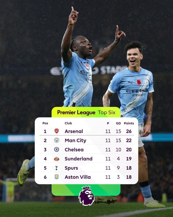 英超变天曼城苏醒升第2!距阿森纳仅4分利物浦跌第8+与4队同分