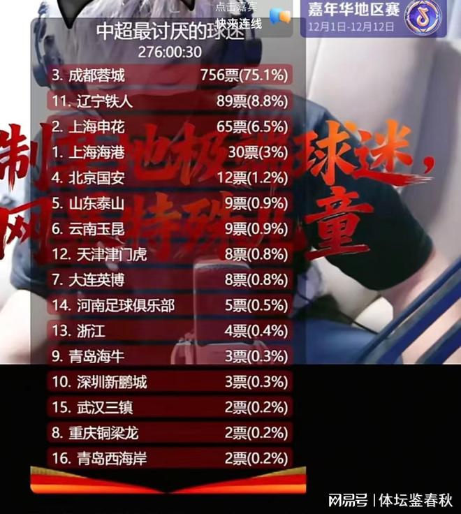 虽然2025赛季的中超联赛已经结束,但球迷们的热情却依然高涨。而近期一次看似随意的直播投票,却在球迷圈里掀起了不大不小的波澜。最近,一位大连体育博主在自己的直播间里突发奇想,搞了一个“中超最不受欢迎球迷榜”的投票。本来只是聊天互动,没想到投票结果一出来,弹幕直接炸屏了。令大家感到意外的是,排在这份榜单第一位的,不是大家印象中上海申花和北京国安这些争议大的老牌球队球迷,而是成都蓉城球迷,而且票数优势非常明显,比第二名的辽宁铁人球迷足足多出近700票。很多人第一反应都是意外,有人甚至在直播间里反复确认是不是点错了选项。毕竟从成绩到关注度,成都蓉城这些年更多是被讨论“踢得好不好”“氛围热不热”,很少在这种榜单上占据头名。但弹幕里的解释来得也很快。有球迷直言,成都蓉城队其实挺招人喜欢,打法积极,场面好看,问题主要集中在部分极端球迷身上。尤其是客场比赛时,一些摩擦被不断放大,球迷在客场惹事和主队球迷起干架,在不同城市的看台上都出现过。更具争议的,是成都蓉城某球迷组织被很多其他地区球迷贴上了“中超巡打队”的标签。这个称呼在社交平台上已经流传了一段时间。比赛踢到哪,相关话题就跟到哪,场外的故事甚至有时比比赛还抢镜。真正让人看不懂的,是排在第二位的辽宁铁人球迷。一些人发问,铁人队不是刚升上中超吗,怎么一下子就冲到第二了?按理说他们在全国范围内的“存在感”有限。但如果把投票背景放回直播间本身,这个结果似乎又没那么离谱。因为投票是在大连体育博主的直播间,而大连与辽宁铁人之间的关系,懂的都懂。地域情绪、历史恩怨,加上升班马的突然出现,很容易成为情绪的宣泄口。反过来看,也正是这个结果说明了问题,在这样一个环境下,大连球迷的“死敌”辽宁铁人,票数其实并没有拉开到夸张的程度。排名榜单第三和第四的,分别是上海申花球迷和上海海港球迷,这个排序相对容易理解。两支上海球队关注度高,球迷众多,声音自然大,摩擦出现的概率也更高。至于北京国安的球迷,则排在第五位,有意思的是,一些中立球迷还帮忙解释,北京球迷最多就是嘴上狠,骂得凶,但真正动手的情况并不多,至少在近些年的客场,并没有出现过太多的冲突。当然,这份榜单本身就带着强烈的地域和场景属性。有人在直播间里半开玩笑地说,如果换成四川本地体育博主开播搞投票,第一名肯定会变成河南球迷了。听着像玩笑,其实也点破了这种榜单的本质,情绪、立场、参与投票的人群,都会直接影响到最终结果。但即便如此,这次投票还是折射出一个现实,中超联赛的讨论,早就不只停留在技战术层面。看台文化、球迷行为,正在被越来越多人放到显微镜下反复审视。也许有些标签并不完全公平,但当同样的声音反复出现时,值得每一个参与其中的人冷静想一想,热爱足球的方式,是不是也该改一改了?