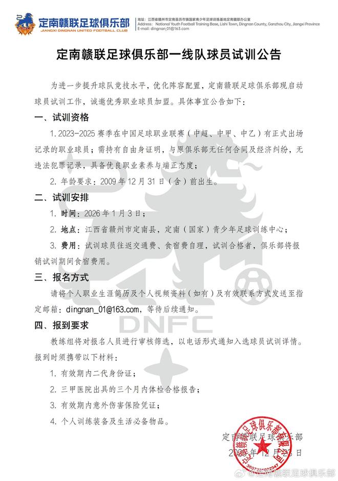 一周前,中足联公布了新赛季联赛准入首批完成债务清偿的俱乐部名单。这意味着新赛季准入已经进入冲刺阶段,尚未亮相债务清偿名单的俱乐部,需要抓紧时间工作,争取下一批过关;已经完成债务清偿的俱乐部,则需准备其他准入材料,确保拿到准入执照。其中,位于中甲的定南赣联,顺利出现在了首批完成清偿名单中。随后,他们迅速发布了一线队球员试训公告,启动了新赛季球员遴选工作。由于该队前任主教练刘建业已经履新执教中超升班马重庆铜梁龙,新任主教练毛彪刚刚到任,所以,此次试训应该是新帅毛彪主导的赛场点兵。他会结合球队现状,以及个人执教思路,选出适合新阵容体系的球员,从而优化阵容配置,打好新赛季中甲。与很多球队的试训公告不同,定南赣联的此次试训,只设了年龄下限要求,即要求试训球员在2009年12月31日前出生;但并没有设年龄上限,这也就意味着包括“80后”在内的老将,都有试训机会。当然,此番试训公告还有一点不同之处就是,要求试训球员必须具有2023-2025赛季在中国足球三级职业联赛(中超、中甲、中乙)有正式出场记录。这意味着有职业联赛出场时间,甚至经验丰富的球员,会有更大竞争优势。想必这一条会将很多球员挡在门外。另外,和大多数俱乐部一样,定南赣联也要求试训球员需持有自由身证明,与原俱乐部无任何合同及经济纠纷。定南赣联的前身是成立于2014年的安徽力天。2015年底,俱乐部更名为黑龙江火山鸣泉,并搬迁到哈尔滨,随后在2021年更名为黑龙江冰城。2025年1月,俱乐部远迁至江西赣州定南,更名为定南赣联,由此翻开了崭新的绿茵篇章。刚刚过去的2025赛季,驰骋中甲赛场的定南赣联,最终取得了11胜11平8负进40球失35球积44分的战绩,位列中甲积分榜第6。新赛季,在新帅毛彪的带领下,在定南踏上第二年征程的这支球队,会取得怎样的成绩呢?让我们拭目以待。